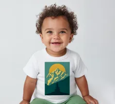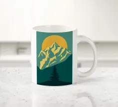 Questa suggestiva stampa d'arte cattura la serena maestosità di un paesaggio montano con un tocco moderno e geometrico. Un sole dorato e brillante sorge dietro una catena montuosa affilata e sfaccettata, proiettando un bagliore caldo e luminoso. Il primo piano è caratterizzato da colline stratificate nei toni del verde e del blu, con un albero sempreverde solitario che si staglia contro le cime vibranti. Le linee pulite e stilizzate e i colori ricchi e contrastanti rendono questo pezzo un perfetto connubio tra natura e design contemporaneo. È un complemento ideale per chiunque voglia dare un tocco di bellezza minimalista e di colore deciso alla propria casa, ufficio o studio.