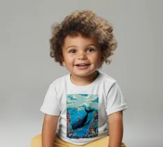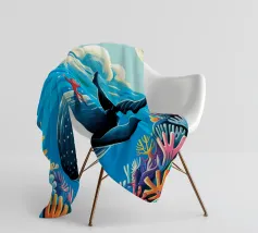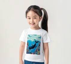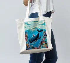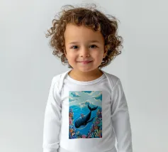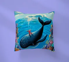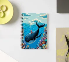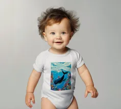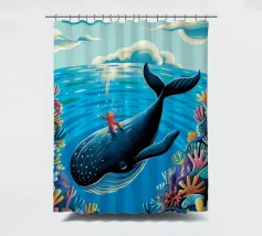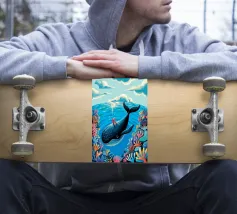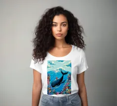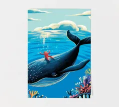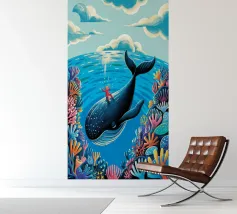 Una colossale balena scivola nelle profondità, circondata da barriere coralline radiose e onde celestiali. L'oceano si trasforma in un paesaggio da sogno surreale, dove i blu profondi si fondono con nuvole di luce fluttuanti.