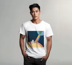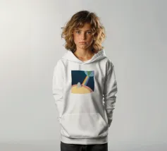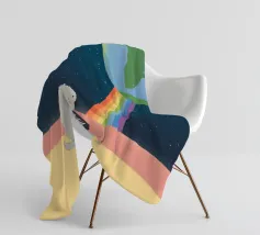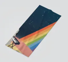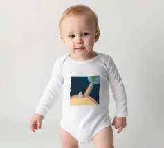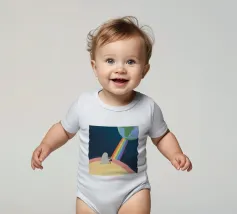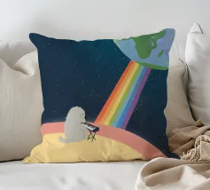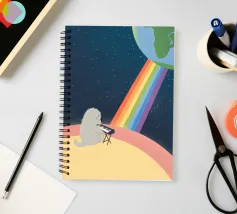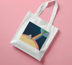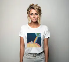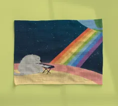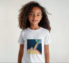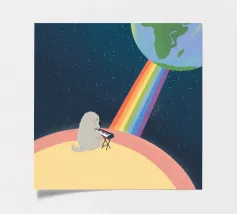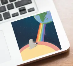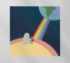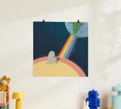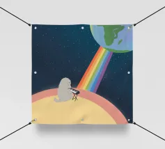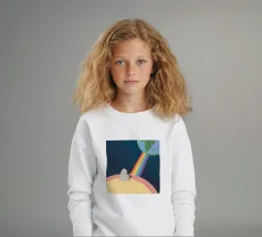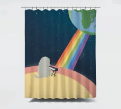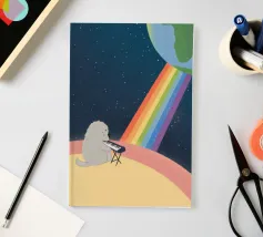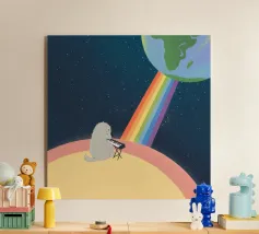 Una piccola creatura siede su un pianeta e guarda attraverso un telescopio. Un arcobaleno si estende sulla distesa cosmica, collegando il pianeta alla Terra e creando una miscela surreale di esplorazione e bellezza.