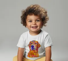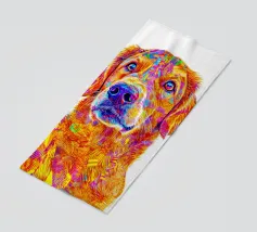 Un'opera d'arte digitale altamente dettagliata di un cane che presenta un disegno astratto e multicolore con tratti decisi e tonalità vivaci di giallo, arancione, rosa e blu. Gli occhi espressivi aggiungono profondità alla composizione, creando un effetto suggestivo e artistico.