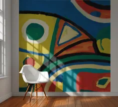 Un dipinto astratto potente e vibrante è una pura espressione di colore e forma, con pennellate audaci e ampie di giallo, verde e blu che creano una composizione dinamica e carica di emozioni.