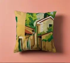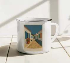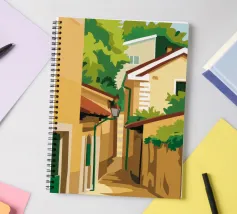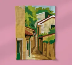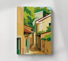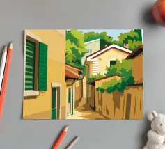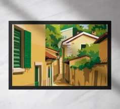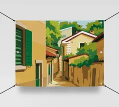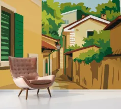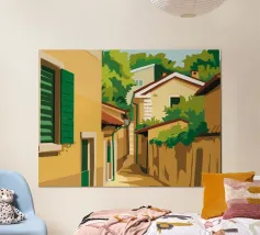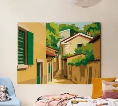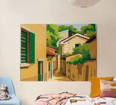 Uno stretto vicolo di un villaggio in stile toscano è immerso nella luce del sole, con edifici dai toni caldi, persiane verdi e piante in vaso, che evocano il fascino rustico e la tranquillità della campagna italiana.