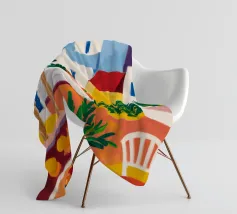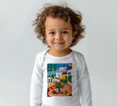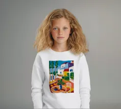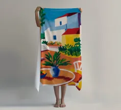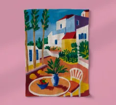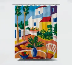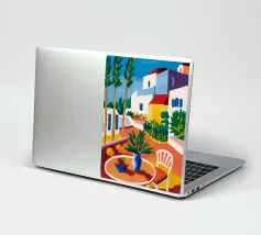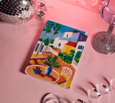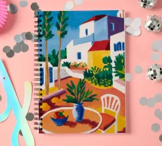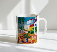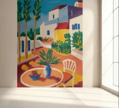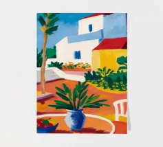 Una persona siede su una sedia bianca in un patio di terracotta inondato di sole di una villa bianca con persiane blu, circondata da piante verdi in vaso sotto un cielo azzurro.