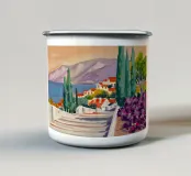Una parete bianca della villa, ornata da vibranti bouganville viola, incornicia una classica vista mediterranea di cipressi e del mare blu scintillante, catturando l'essenza di una perfetta vacanza costiera.
