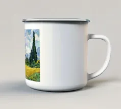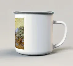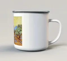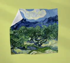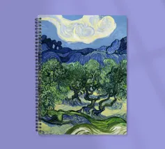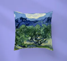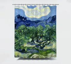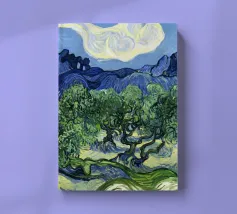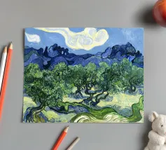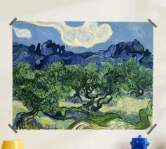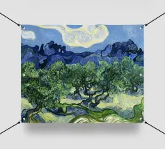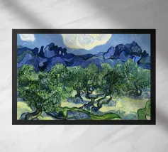 Dipinto durante il soggiorno di van Gogh al manicomio di Saint-Paul-de-Mausole a Saint-Rémy, questo vibrante paesaggio cattura l'aspra bellezza della Provenza attraverso la prospettiva emotiva dell'artista. Gli ulivi ondulati, resi in blu e verde vorticosi, dominano il primo piano, con i loro tronchi nodosi e le foglie argentate animate dalle caratteristiche pennellate spesse e ritmiche di van Gogh. Sullo sfondo si ergono le drammatiche montagne delle Alpilles, dipinte in caldi colori ocra e viola che contrastano con i toni freddi dell'uliveto. Il dinamico cielo di Van Gogh, caratterizzato dalla formazione di nuvole espressive.