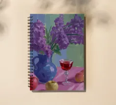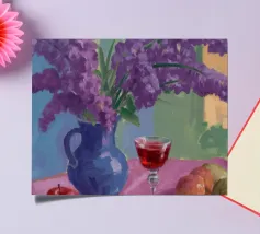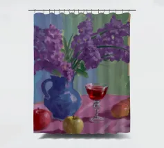 Un'invitante natura morta che mostra un bouquet di lillà viola in una brocca blu, accanto a un bicchiere di vino rosso, una mela croccante e altri frutti assortiti, suggerendo un momento di raffinata indulgenza.