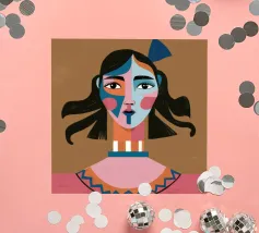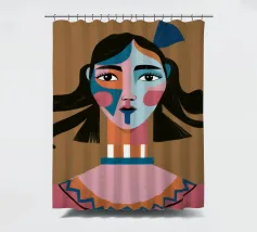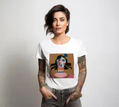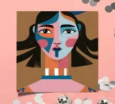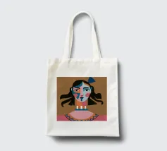Un ritratto moderno e astratto di un volto di donna con macchie di blu e tratti espressivi, ornato da un grande fiocco blu tra i capelli, su uno sfondo caldo e terroso.