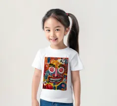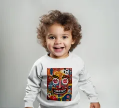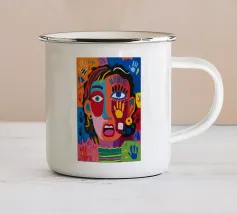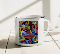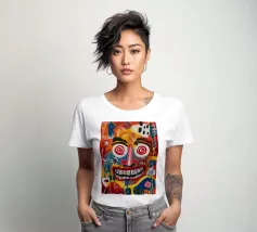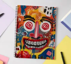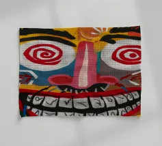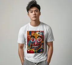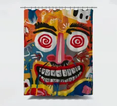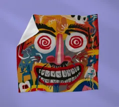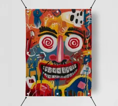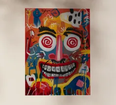 Un volto con occhi vorticosi e ipnotici e un sorriso esagerato domina il dipinto. Colori vivaci e tratti astratti dinamici intensificano l'atmosfera energica.