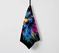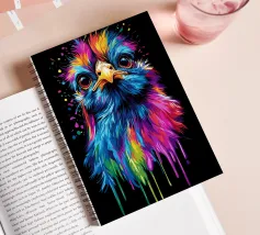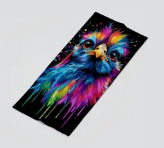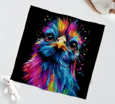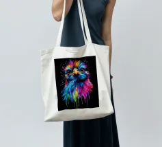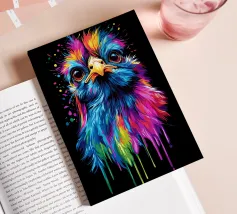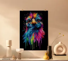 Una gallina di seta colorata guarda dritto davanti a sé con occhi grandi e curiosi. Le piume brillano in vibranti tonalità di blu, rosa, viola, giallo e verde, con i colori che sembrano gocciolare verso il basso in modo fluido. Lo sfondo è di un nero intenso, che accentua ancora di più le intense sfumature di colore. La sfumatura a goccia conferisce al motivo un effetto dinamico, mentre l'espressione facciale dell'animale emana un misto di curiosità e dignità. Un vero e proprio eye-catcher dal sapore urbano.