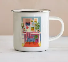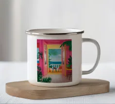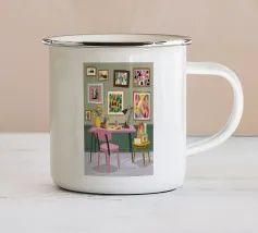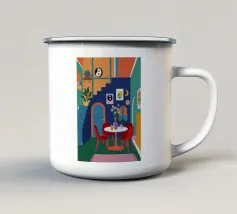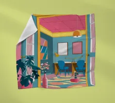 Un interno moderno ed elegante viene visto da un'altra stanza, mostrando un vibrante gioco di colori, mobili contemporanei e arte, creando una scena sofisticata e stratificata.