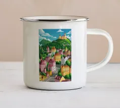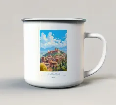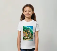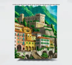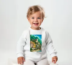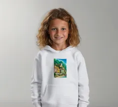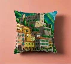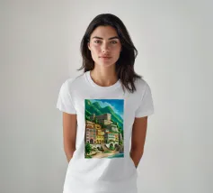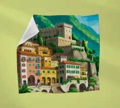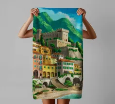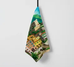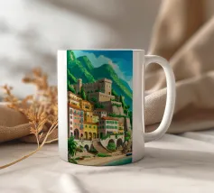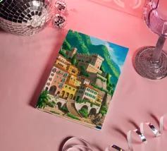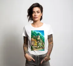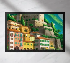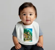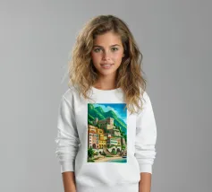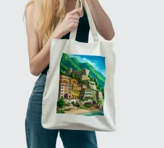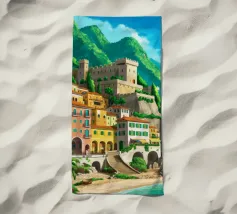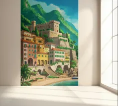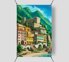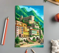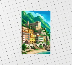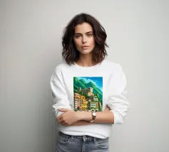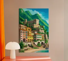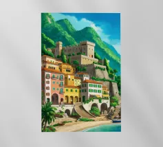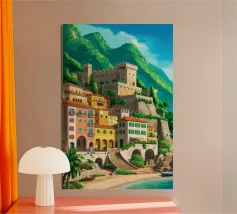 Uno splendido paesaggio pittorico delle case colorate di Positano, che scendono a cascata lungo la scogliera fino al mare. L'opera è una rappresentazione bella, vibrante e iconica della bellezza mozzafiato della Costiera Amalfitana.