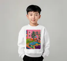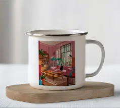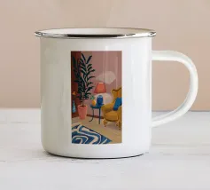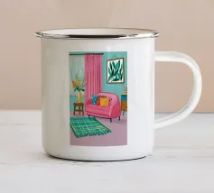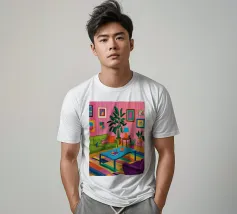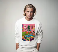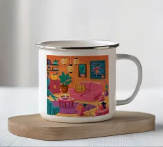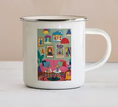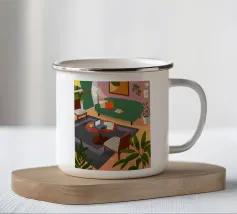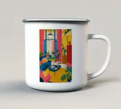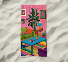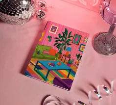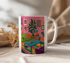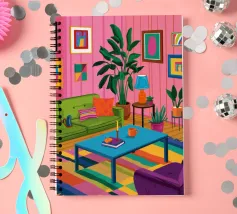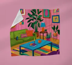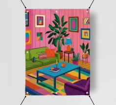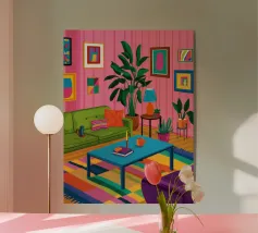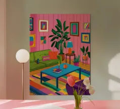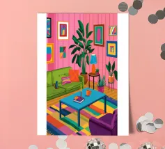 Un'illustrazione vivace di un soggiorno eclettico e massimalista con mobili colorati, una parete a galleria, numerose piante d'appartamento e un tappeto viola.