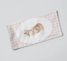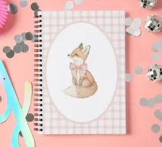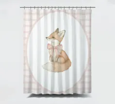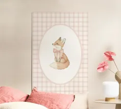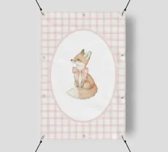 Questa immagine raffigura una volpe seduta in posizione eretta con un grande fiocco rosa intorno al collo. La volpe ha una pelliccia bianca e marrone rossastra e un'espressione calma, che aggiunge un tocco affascinante e stravagante.