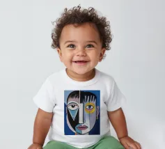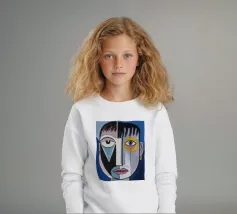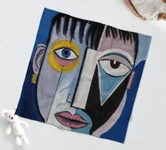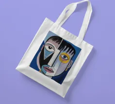 Questa opera d'arte presenta un volto geometrico astratto con linee decise e un mix di colori blu, giallo e verde. Lo sfondo è pieno di forme geometriche, che si aggiungono al tema astratto generale.