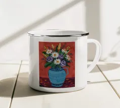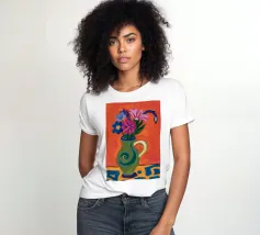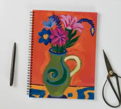 Un'espressiva natura morta di fiori colorati in una brocca verde decorata con un vortice stravagante. Il caldo sfondo arancione e lo stile pittorico creano una scena vibrante, artistica ed energica.