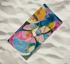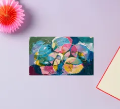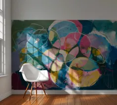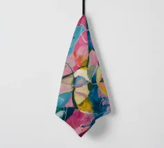 Una composizione astratta e vorticosa di blu, verdi, rosa e gialli vibranti ricorda un fiore che sboccia o una nebulosa celeste. Il movimento dinamico e la ricchezza dei colori creano un'opera d'arte astratta accattivante ed energica.