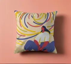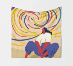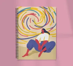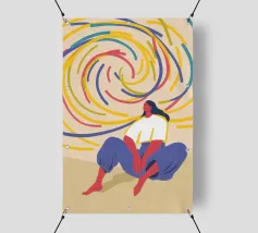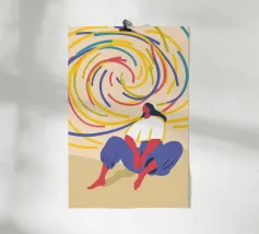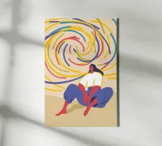 Una figura siede in una posa contemplativa al centro di un vibrante vortice multicolore, illustrando il concetto di un mondo interiore di emozioni complesse o di un vortice creativo.