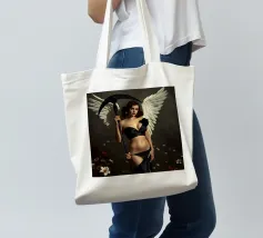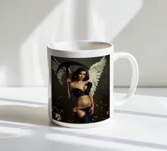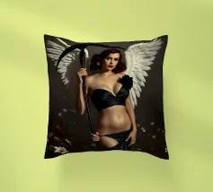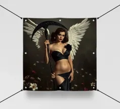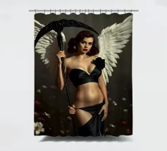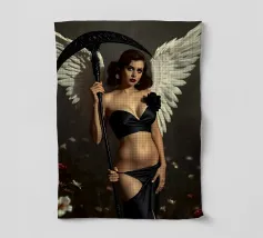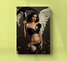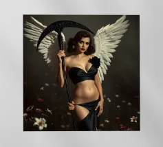 Questa immagine mostra un'affascinante modella pin-up nei panni dell'Angelo della Morte, in posa in un drammatico campo di fiori appassiti, circondata da una nebbia inquietante, con una falce e rose nere, in un mix di film noir degli anni '40 ed elegante arte pin-up.