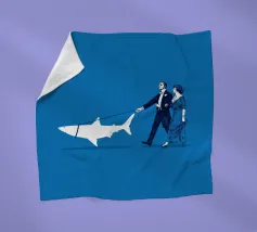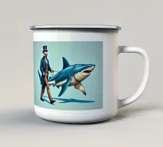Un gentiluomo vittoriano elegantemente vestito e la moglie conducono con sicurezza un grande squalo bianco al guinzaglio su una superficie riflettente, fondendo l'eleganza storica con la fantasia surreale in dettagli vibranti.