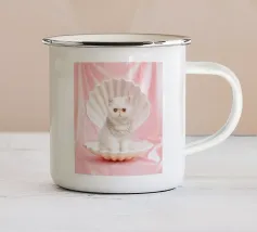 Un soffice gatto con gli occhi spalancati è seduto in una vasca da bagno piena di bolle, circondata da un bagno floreale azzurro e rosa. La scena offre un'espressione stravagante e leggermente sorpresa del gatto bagnato.