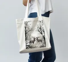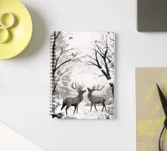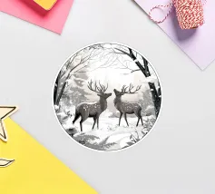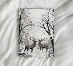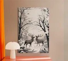 : Catturate la tranquilla bellezza di una mattina d'inverno con questa elegante illustrazione monocromatica. Due maestosi cervi si ergono pacificamente in una serena foresta innevata, con le loro forme rese con splendidi dettagli grafici. La tavolozza minimalista in bianco e nero dell'opera, con una luce soffusa e delicata, è perfetta per creare un'atmosfera di pace in qualsiasi stanza e si adatta a un arredamento moderno, scandinavo o rustico.