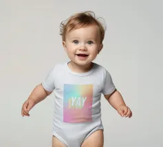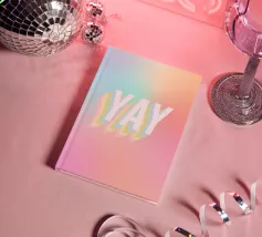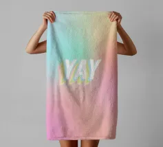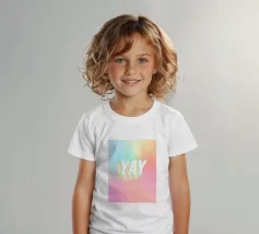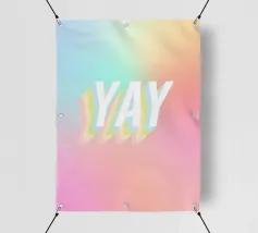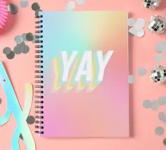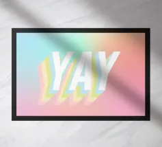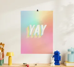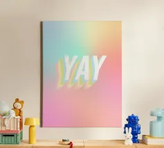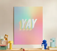 Un'opera d'arte gioiosa ed esaltante, caratterizzata da un audace YAY in un moderno font sans-serif, impreziosito da vibranti ombre arcobaleno 3D. Su un sognante sfondo sfumato in azzurro acqua, rosa pesca e giallo sole, questo disegno irradia positività e pura felicità. Perfetto per le ragazze, i sognatori e coloro che abbracciano la magia dello stile di vita degli unicorni, è una celebrazione giocosa dell'ottimismo e delle buone vibrazioni.