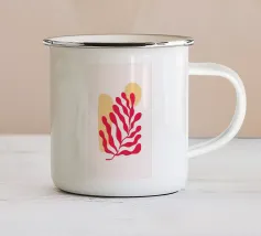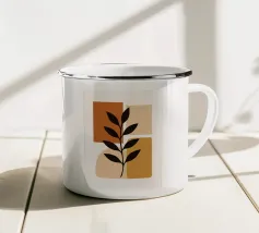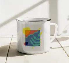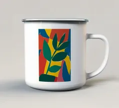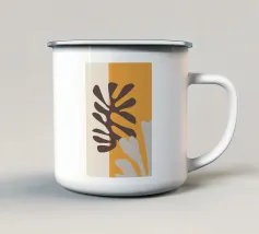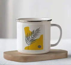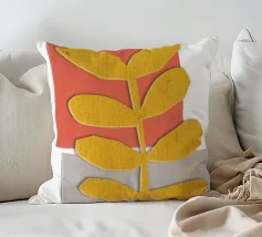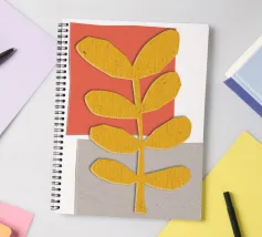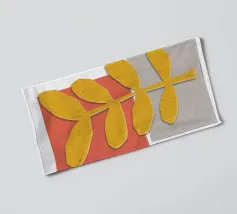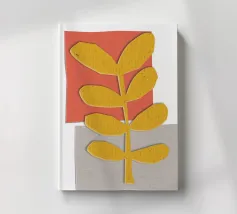 Una forma gialla simile a una foglia è posizionata su uno sfondo corallo, con uno strato rettangolare grigiastro al di sotto. Lo stile del collage crea un'atmosfera minimalista e organica.