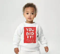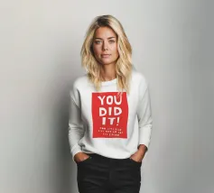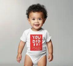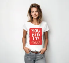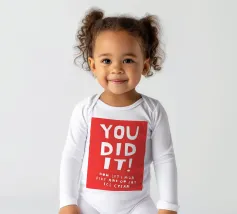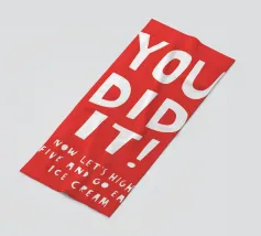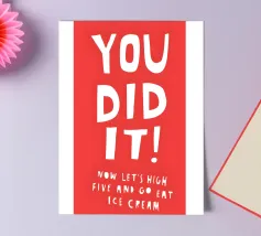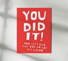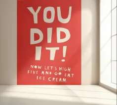 "La frase 'Ce l'hai fatta!' è esposta in grande, in grassetto, a lettere bianche su un vivace sfondo rosso, con il testo più piccolo 'ORA Diamo il cinque e andiamo a mangiare il gelato'".
