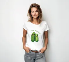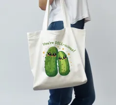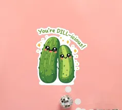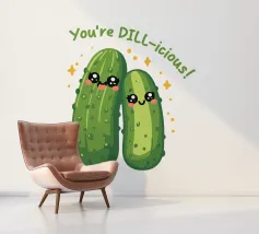 Due simpatici cetrioli, ornati da occhi espressivi e guance rosee, sono uno accanto all'altro. Sopra di loro, il testo scherzoso recita: "Sei DILL-icious!".