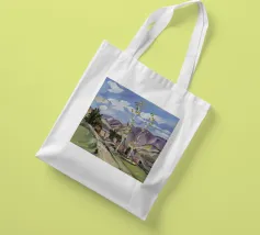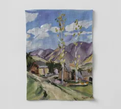 Un dipinto paesaggistico con un'alta pianta di yucca in fiore, con i suoi fiori bianchi che si protendono verso un cielo blu brillante. Sullo sfondo, un villaggio o edifici rustici su un sentiero illuminato dal sole.