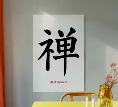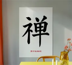 Quest'opera a inchiostro raffigura il carattere 禅 - Zen - nella classica scrittura Kaisho, impostato in modo calmo e chiaro. La componente sinistra 礻 si riferisce allo spirituale, al ritualistico; la componente destra 单 sta per semplicità. Insieme incarnano l'essenza dello Zen: la presenza spirituale attraverso la riduzione. Le pennellate controllate, la struttura chiara e l'assenza di qualsiasi ornamento rendono questa calligrafia un mantra visivo, un'eco silenziosa di chiarezza interiore e concentrazione. Sulla parete appare come un respiro silenzioso nella stanza. Disponibile anche su tessuti, ecc.