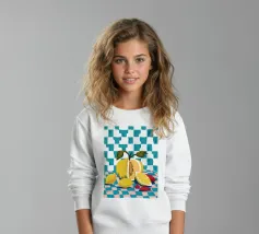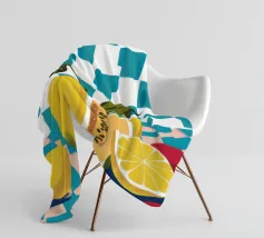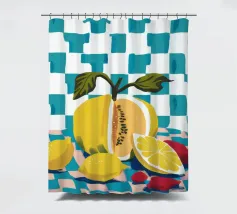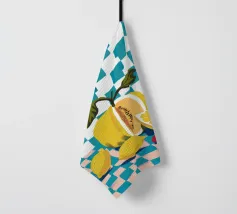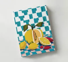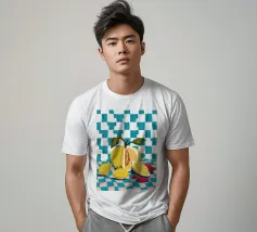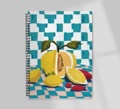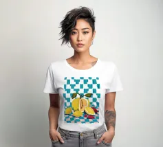 Una natura morta grafica di limoni su uno sfondo a scacchi blu e bianchi. I colori e i motivi decisi creano una composizione fresca, moderna e vivace.