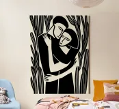 Questa imponente opera celebra il legame umano attraverso la radicale riduzione al bianco e nero. Lo stile si ispira inequivocabilmente all'espressionismo xilografico dei primi del Novecento, di artisti come Ernst Barlach e Käthe Kollwitz, pur possedendo l'eleganza grafica dell'epoca Art Déco. Le linee chiare e le forme chiuse e contrastanti creano un'impressione scultorea e concentrano tutta l'energia emotiva sull'abbraccio centrale. La composizione irradia una profonda malinconia e una calma senza tempo.