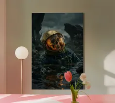 Entrate in un momento di forte contrasto ed emozione. Astronauta di luce che tiene in mano una farfalla in un futuro oscuro presenta un esploratore spaziale solitario in un corridoio ombroso, il cui casco luminoso irradia calore mentre una delicata farfalla riposa delicatamente nella sua mano. L'immagine fonde la fantascienza futuristica con il simbolismo poetico, rappresentando la speranza, la fragilità e l'umanità in un freddo mondo tecnologico. L'illuminazione drammatica, le ombre profonde e la composizione minimalista creano un'atmosfera cinematografica e surreale.