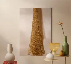 Un primo piano intimo ed elegante che cattura il retro di un fluente abito verde oliva, legato in un morbido fiocco. La composizione minimalista e i toni tenui creano un'atmosfera sofisticata e senza tempo, perfetta come stampa d'arte per interni moderni o spazi ispirati alla moda.