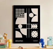Un poster digitale dinamico che celebra la fondazione del Bauhaus nel 1919. La composizione monocromatica presenta una griglia asimmetrica che divide la tela in diversi studi geometrici, tutti in nero e bianco sporco ad alto contrasto. Combina grandi blocchi di forme astratte (cerchi, archi e quadrati) con elementi come una griglia di triangoli e un cerchio disseminato di punti neri. Le linee bianche definiscono la struttura, incarnando l'attenzione modernista per le forme di base e la composizione astratta. Questo download digitale premium vanta 7000x5000 pixel a 300 dpi, assicurando una chiarezza eccezionale e una qualità di stampa superiore.