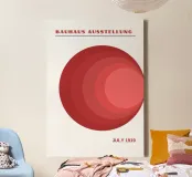 Un manifesto di grande impatto visivo della Bauhaus Ausstellung del luglio 1919, caratterizzato da una forma geometrica monumentale. Il disegno è dominato da un'unica, massiccia forma composta da cinque cerchi concentrici che creano uno straordinario gradiente visivo. I colori passano da un profondo rosso terra di Siena ai bordi a un luminoso rosa corallo/salmone al centro, creando un'illusione ottica di profondità e tridimensionalità. I caratteri tipografici "BAUHAUS AUSSTELLUNG" e "JULY 1919" incorniciano la grafica. Questa stampa digitale ad alta risoluzione (7000x5000 pixel, 300 dpi) offre transizioni di colore impeccabili ed è una