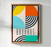 Un poster astratto visivamente dinamico che celebra i principi del design geometrico della scuola Bauhaus. La composizione presenta quattro quadranti interconnessi dominati da archi, semicerchi e un singolo quadrato in una vivace tavolozza di giallo solare, arancione brillante, azzurro e verde acqua intenso, contrastati da un profondo blu navy. Tra gli elementi figurano archi concentrici a strisce nere e marine e un motivo a piccoli punti che crea una texture visiva. La parola "BAUHAUS" è ben centrata in un carattere pulito e verticale. Questo download digitale ad alta risoluzione (7000x5000 pixel, 300 dpi) garantisce un'immagine nitida e colorata.