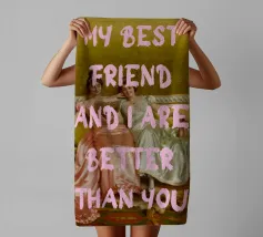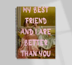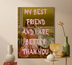 Celebrate il vostro legame indissolubile con "My Best Friend and I Are Better Than You", una spiritosa stampa pop art che unisce l'eleganza classica a una moderna e giocosa dichiarazione di amicizia. Questa accattivante opera d'arte raffigura due serene figure storiche, elegantemente posate su un lussuoso divano, apparentemente impegnate in un libro. Il testo in grassetto, di colore rosa caldo, "IL MIO MIGLIOR AMICO ED IO SONO MEGLIO DI TE" si sovrappone all'immagine, trasformando la scena senza tempo in un'ironica e sicura dichiarazione di esclusività. Perfetto per aggiungere personalità e un tocco di fascino spensierato a qualsiasi spazio contemporaneo. Realizzato ad un