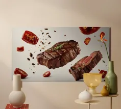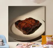 Una bella bistecca alla griglia è adagiata su un piatto bianco, ornato dai segni della griglia. La calda luce del sole mette in risalto i suoi colori ricchi, creando un'atmosfera invitante perfetta per il pranzo.
