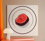 Bistecca succulenta su un piatto bianco dal design semplice tela