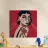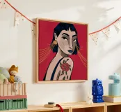 This painting depicts a person with a tattoo of a rose on their shoulder. The person is wearing large, golden earrings, and the background is a striking red, emphasizing the bold and expressive nature of the artwork.
