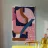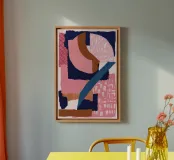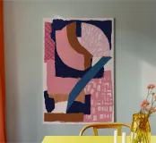 A bold and modern abstract composition features a dynamic arrangement of overlapping shapes in pink, navy blue, and black, with textured details creating a sophisticated and graphic piece.