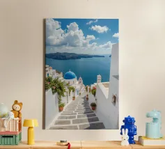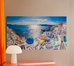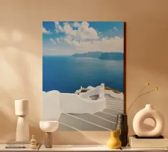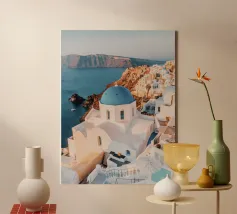 Questa immagine mostra l'armonioso connubio tra l'architettura iconica di Santorini e il blu intenso delle acque del Mar Egeo. Le facciate imbiancate a calce e i vibranti accenti blu delle case sulla scogliera creano un contrasto sorprendente con l'aspra caldera. Gli eleganti yacht galleggiano pacificamente sotto di noi, aggiungendo un tocco di lusso moderno. Il gioco della luce del sole sugli edifici e sull'acqua completa questo idilliaco scenario mediterraneo, a testimonianza del fascino duraturo di Santorini come destinazione turistica di primo piano.