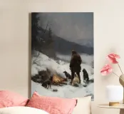 Cacciatore d'inverno al fuoco - Cacciatore con cani Stampa d'arte tela