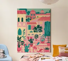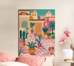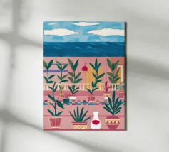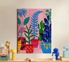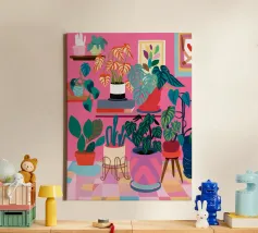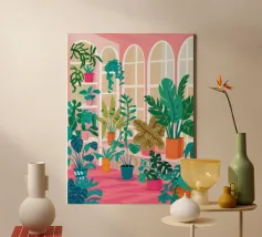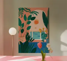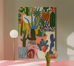 Piante in vaso colorate sono disposte lungo un sentiero tortuoso, su uno sfondo vibrante e astratto di forme geometriche. La composizione presenta varie tonalità di verde, blu, rosa e giallo, creando un'atmosfera vivace e allegra.
