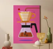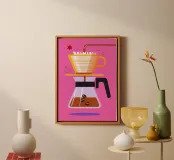 Illustrazione grafica di una caffettiera in azione, su uno sfondo rosa intenso. La rappresentazione moderna e stilizzata è un perfetto omaggio all'arte e al rituale del caffè speciale.