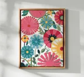 Un campo denso e gioioso di vari fiori stilizzati in una caleidoscopica gamma di colori vivaci. L'illustrazione è una celebrazione della diversità e della bellezza della natura, resa in uno stile grafico e allegro.