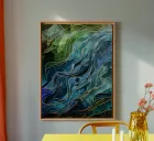 Un'ipnotica opera d'arte astratta caratterizzata da vorticose e vibranti tonalità di blu, verde e oro. Le linee e i motivi intricati evocano un senso di profondità cosmica e di bellezza eterea. Questo pezzo è perfetto per aggiungere un tocco di eleganza e raffinatezza a qualsiasi spazio.