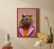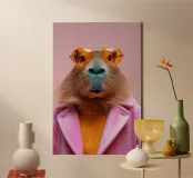Un ritratto unico e spiritoso di un capibara vestito con un vivace cappotto rosa e un maglione giallo senape, sormontato da audaci occhiali da sole arancioni.